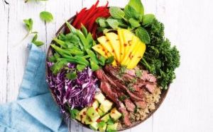 Step 5: Divide quinoa among serving bowls. Top with beef, snow peas, baby broccoli, cabbage, capsicum, avocado and mango. Drizzle with the dressing.